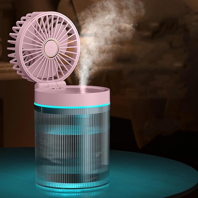 Mist Rechargeable Fan with 7-Color Night Light & Humidifier – Portable, 3-Speed Cooling, 1200mAh Battery (3-Hour Backup), Quiet & Foldable for Home, Office & Travel (Pink)